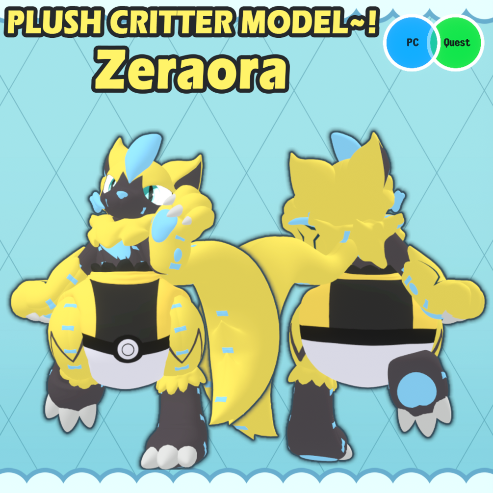 The Zeraora x Midnighth Lycanroc Critter vrchat models including FBX, Blender files, photoshop files, and the textures along with a few lil fun toggles for those weirdo's out there >wO